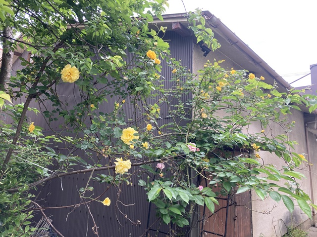 倉庫の裏庭の黄色いバラが