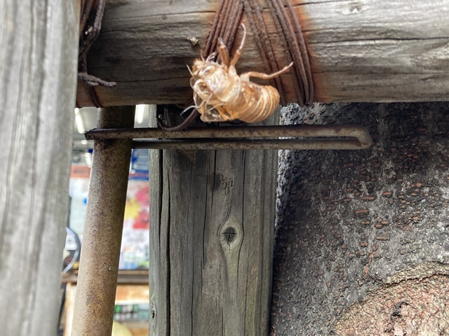昨日の朝セミの抜け殻が店のシャッターの前に