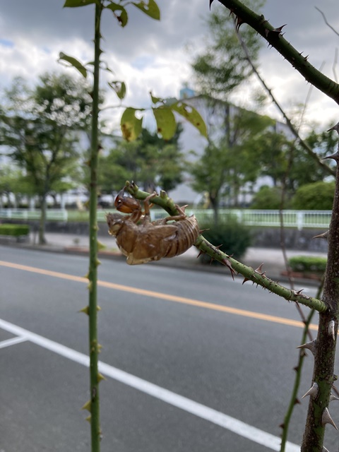 セミの抜け殻が2個、また、店の前のバラの枝に