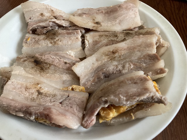 で、今回は、豚肉2個の間に厚焼きたまごを入れて