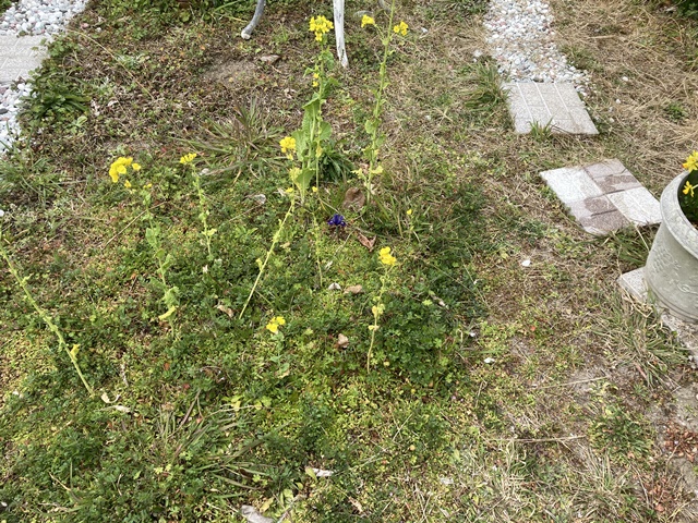 倉庫の裏庭の菜の花と菜の花の間に、、