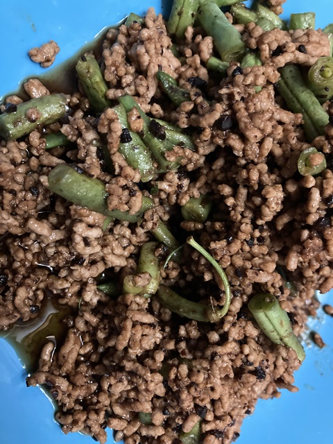 豚ひき肉とエンドウ豆の豆鼓醤<トウチジャン>炒めを