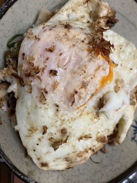 で、ご飯の上にこの豆鼓醤炒めを乗せ、最後に目玉焼きの両面焼いた