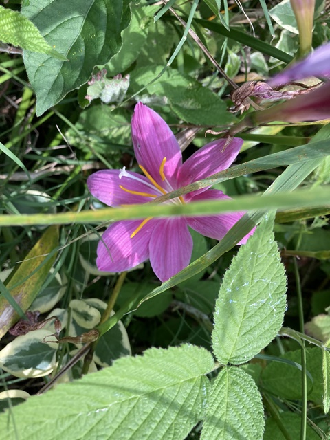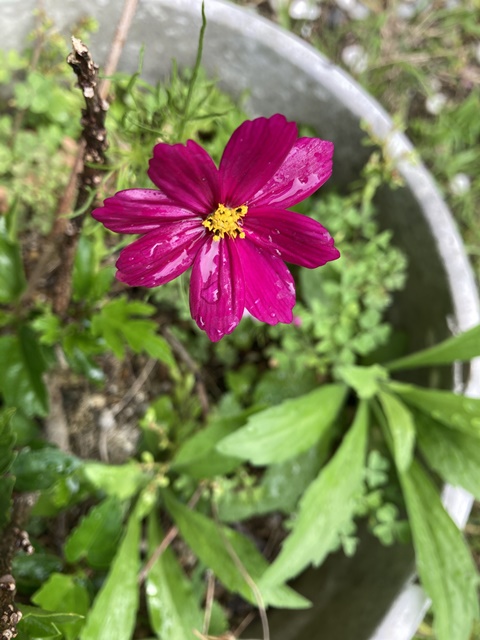 倉庫の裏庭でコスモスとレインリリーが