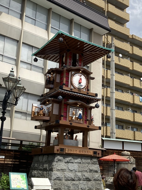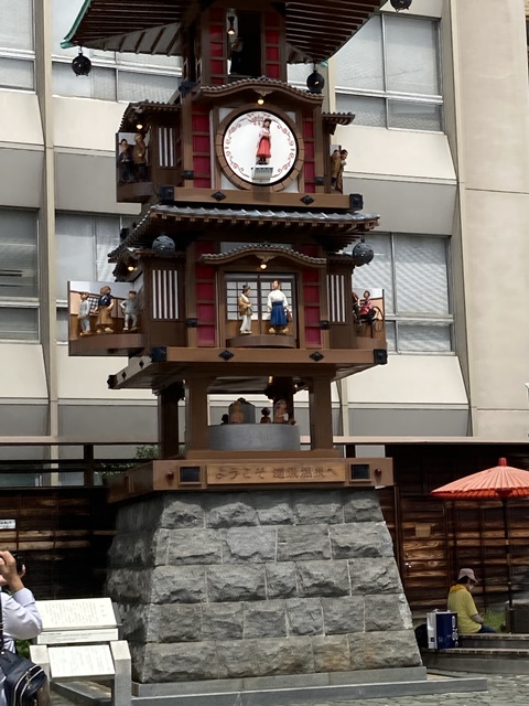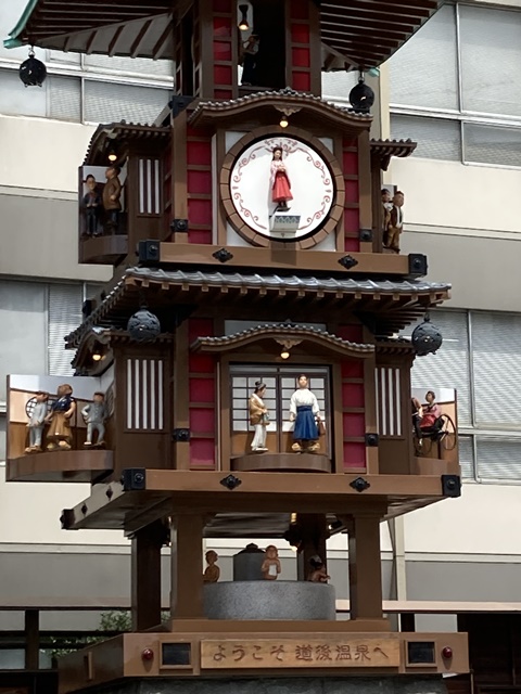 まわり、観光客だらけ、、時計は、「坊ちゃん」のキャラクターで、
