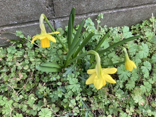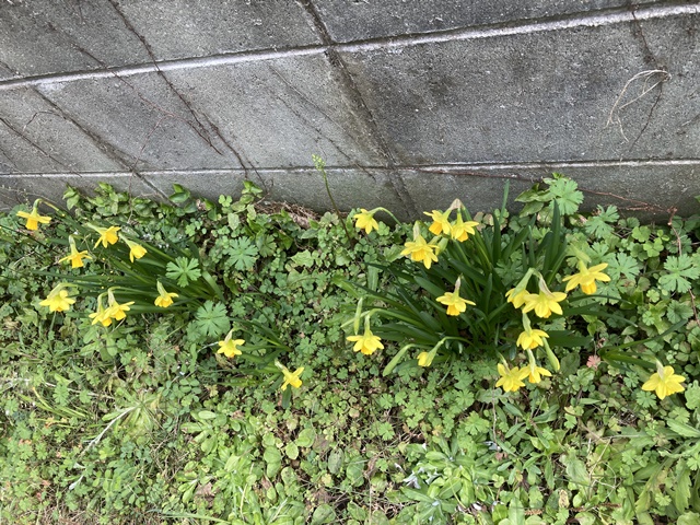 倉庫の裏庭のスイセンが