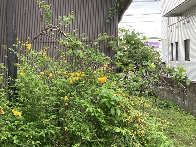 倉庫の裏庭のヤエヤマブキが満開