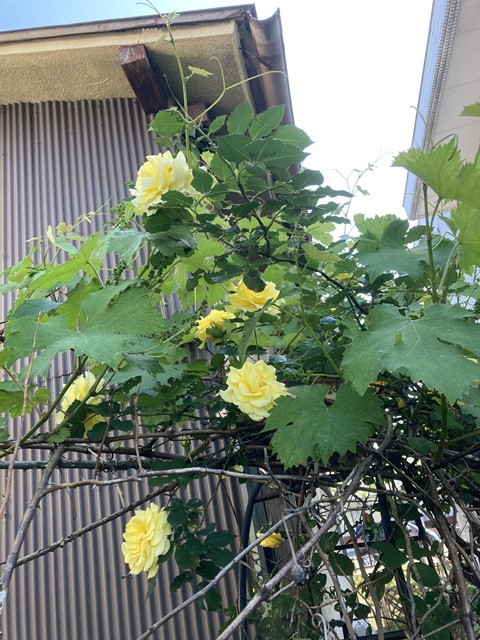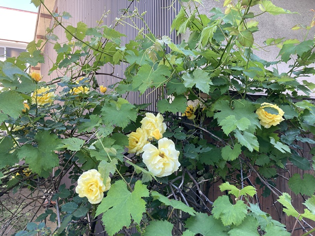 倉庫の裏庭の黄色いバラが満開に