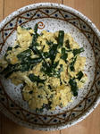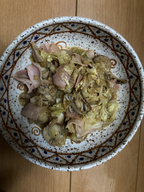 ニラの卵とじホタテとベーコンとキャベツのバター醤油炒め