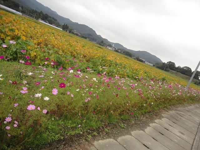 安の里の先の写真です、コスモスとエダマメの畑?の写真です。