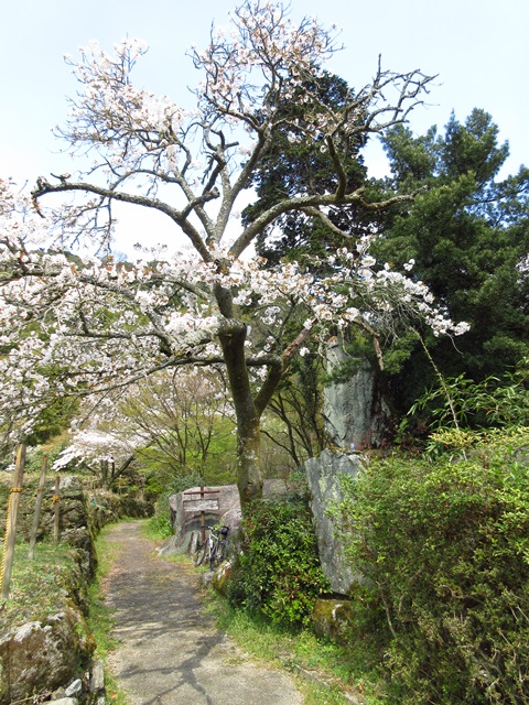 秋月の腹切石です、、<左の写真の桜の樹の左側の平たい石です>