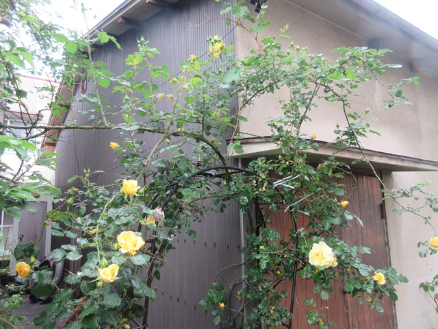 倉庫の裏庭の黄色いバラが