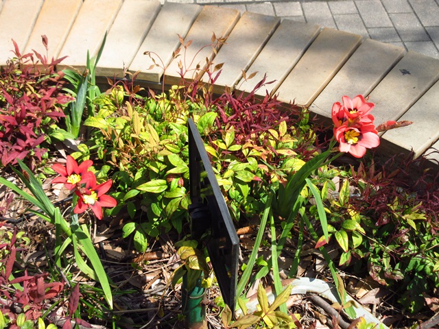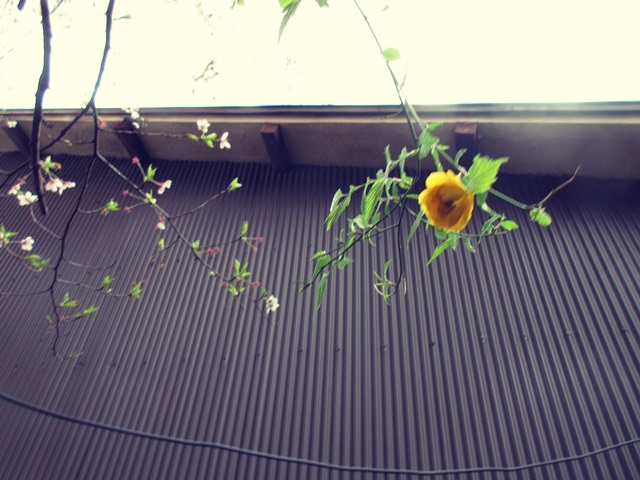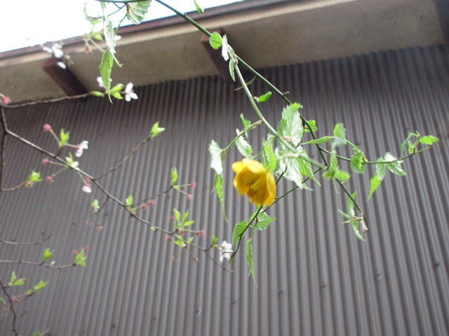 倉庫の裏庭の桜の隣の山吹が咲きました