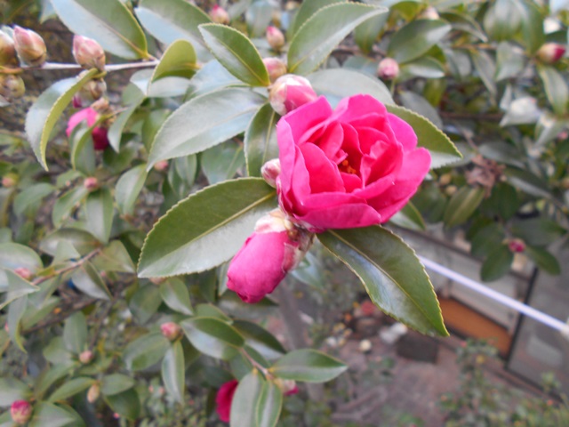倉庫の裏庭のサザンカも地面に近い方から