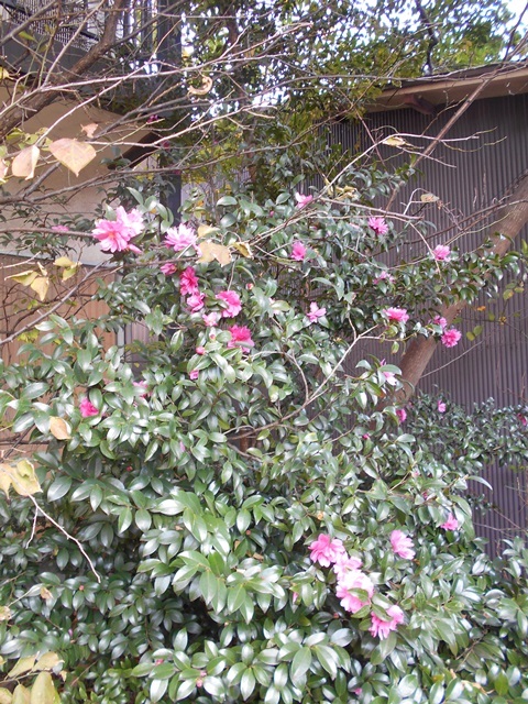 倉庫の裏庭のサザンカが満開に