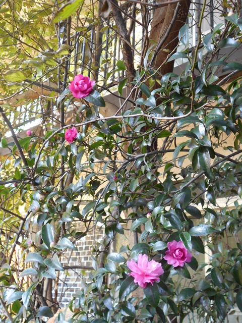 倉庫の裏庭のサザンカが数輪