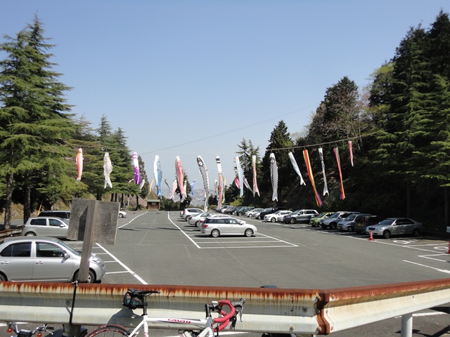 で、写真は油山の駐車場に泳いでいるこいのぼりです。