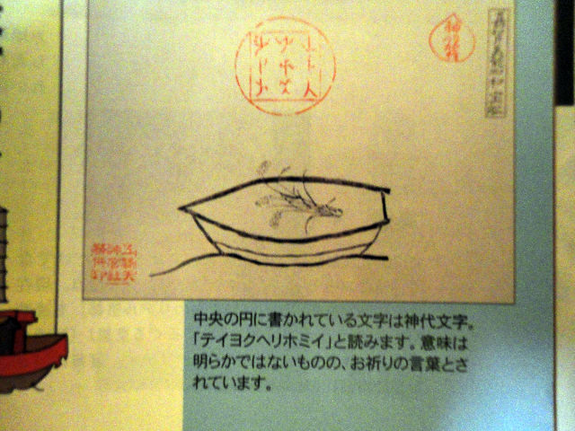 上に書いてある文字は神代文字で、「テイヨクヘリホミイ」