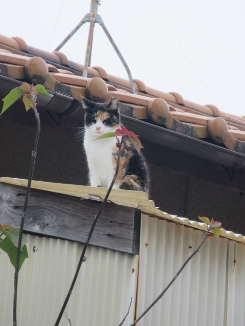 鳴いているので、見上げれば屋根の上、あの三毛猫が