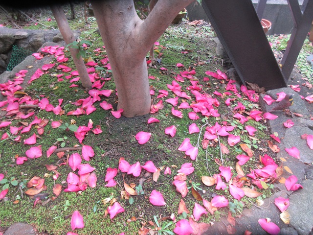 サザンカの花がコケの上に落ちて