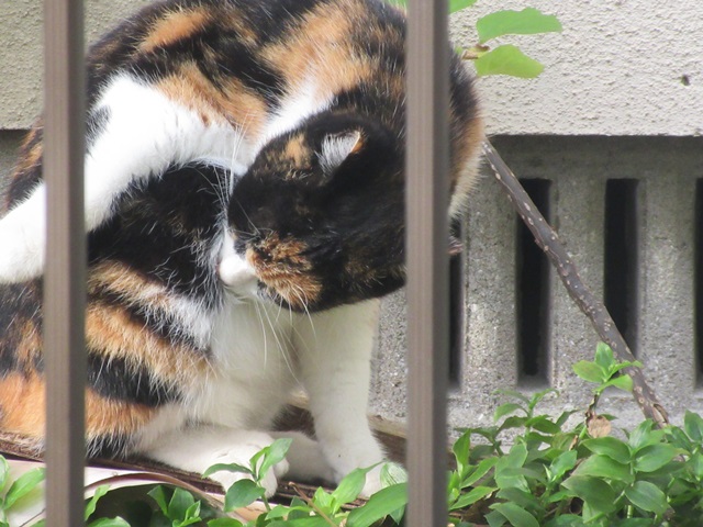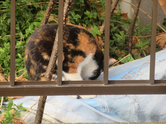 朝、毛のお手入れが忙しいのか?<真ん中と右の写真>